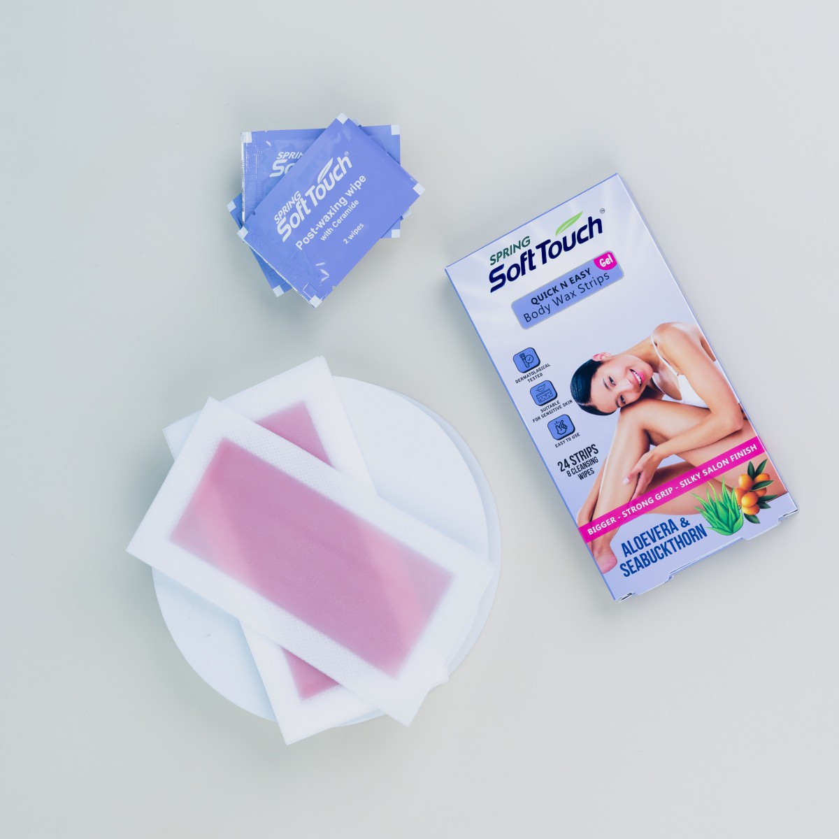 Spring SoftTouch Quick-N-Easy Gel Body Wax Strips with Aloe Vera and Sea Buckthorn give you salon-like smoothness in the comfort of your home. Enriched with skin-loving ingredients, these strips gently remove unwanted hair from the root, leaving the skin soft, nourished, and hair-free for weeks. Designed for convenient use with minimal preparation, they are suitable for legs, arms, underarms, and the bikini line, making them an ideal choice for quick and effective at-home hair removal.